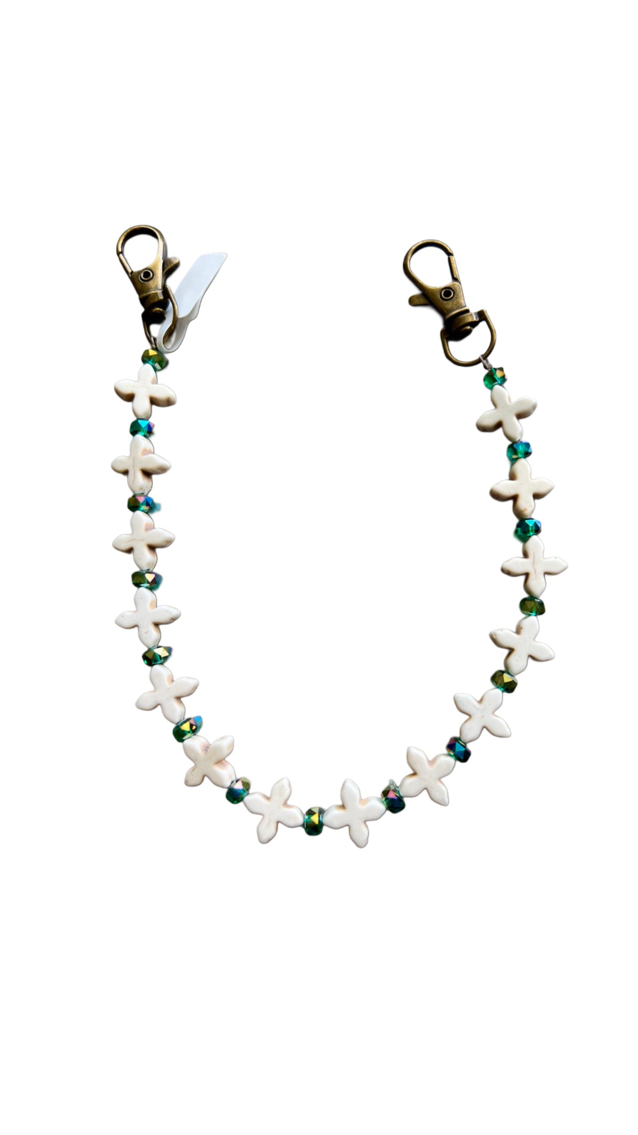 This cute little bag charm measures approximately 12 inches wide and is done with white flowerettes with a beautiful sparkly turquoise bead in between the hardware is bronze