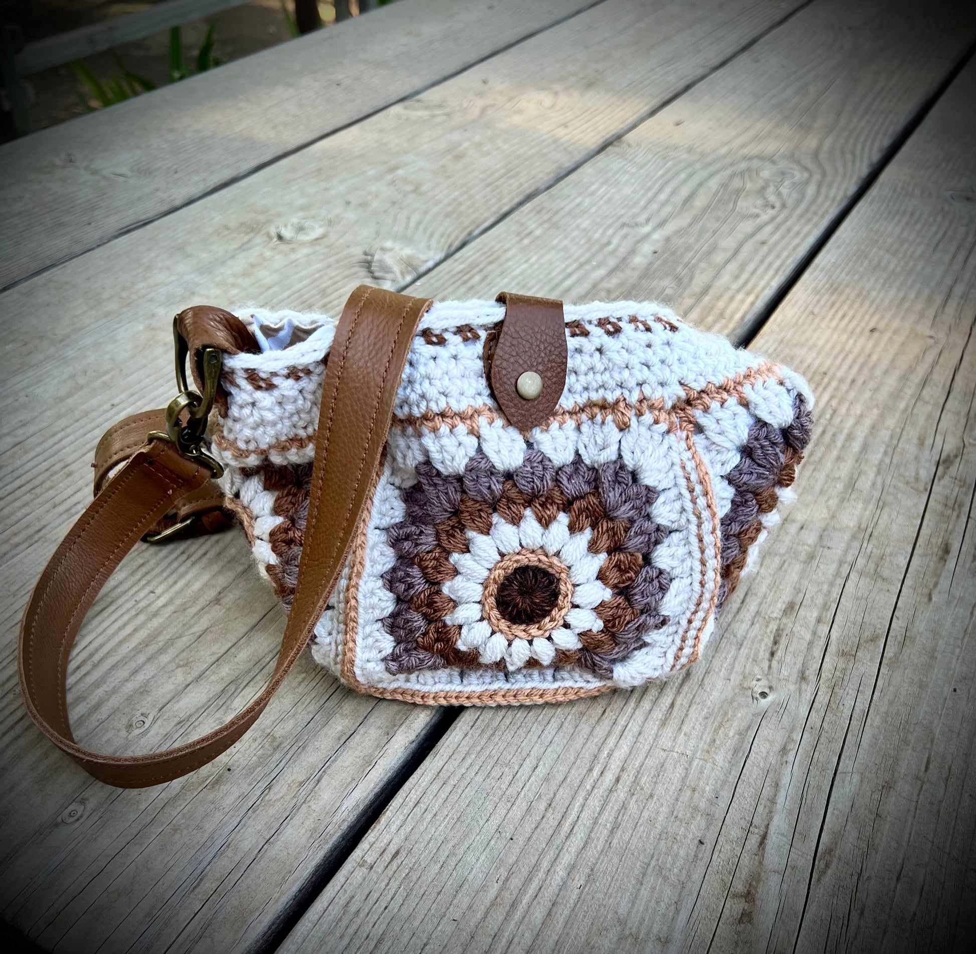 These adorable bags are crocheted in the granny square pattern. They are cute and compact just big enough for the essentials. Measuring approximately 8” across by 7” tall. These bags are finished off in genuine leather accents. Purse has a snap closure. These are the perfect addition to your BoHo outfit