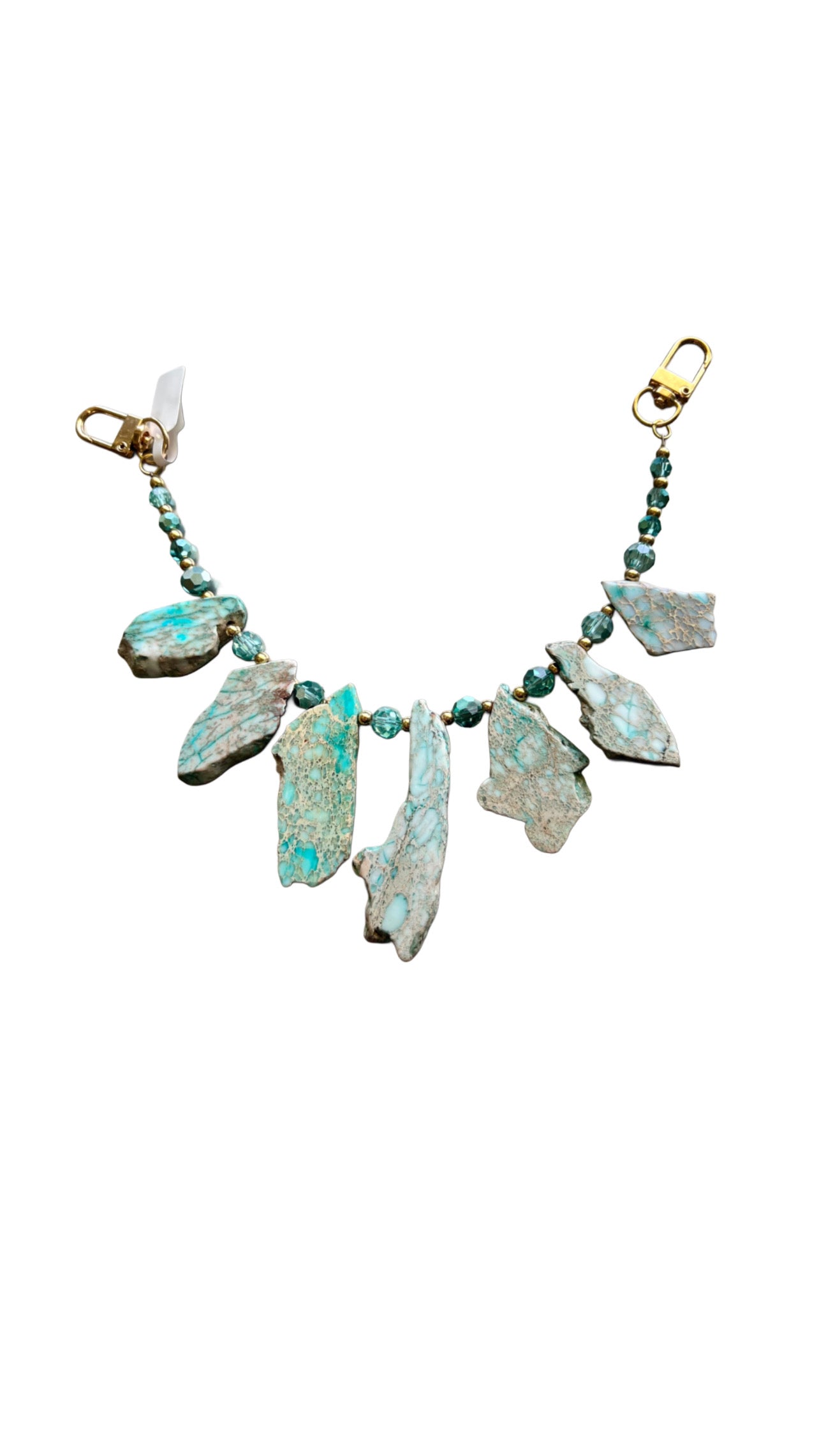 Metal hardware is gold accents are gold and turquoise bling beads, turquoise slabs, and it measures 11 inches wide